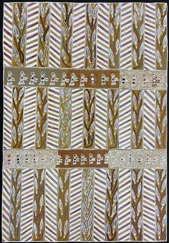 This artwork represents totemic finches. These birds herald the beginning of the dry season and are associated with the Ganalbingu clan. Lidji Lidji are also represented in ceremonial song and dance.