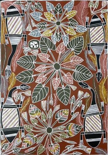 The creation story for Ganalbingu people took place near the middle section of the Glyde River where it becomes the Goyder River. Their land, Ngaliyindi, sits astride the Arafura Swamp in Central Arnhem Land. Many Ganalbingu artists paint totemic species significant to their clan. These can include baru (crocodile), banda (long necked turtle), buliya (catfish), yalman (waterlilies), gumang (magpie geese), dakawa (fresh water yabby), ratjuk (barramundi), warrnyu (flying fox) and more.