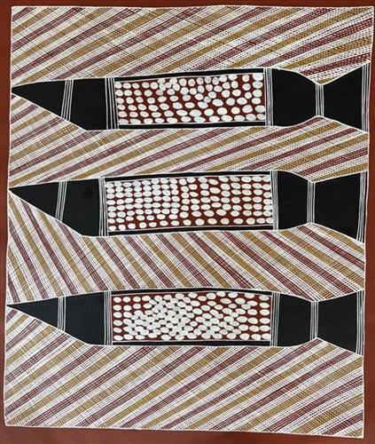 This painting depicts naku (canoes) that were made traditionally from the bark of a particular tree and used for hunting. In this painting, the canoes are filled with gumang (magpie geese) eggs.