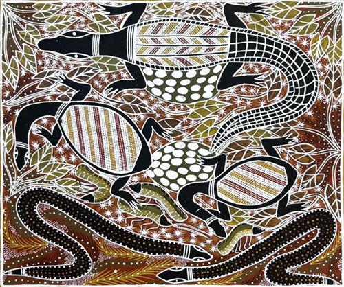 The creation story for Ganalbingu people took place near the middle section of the Glyde River where it becomes the Goyder River. Their land, Ngaliyindi, sits astride the Arafura Swamp in Central Arnhem Land. Many Ganalbingu artists paint totemic species significant to their clan. These can include baru (crocodile), banda (long necked turtle), buliya (catfish), yalman (waterlilies), gumang (magpie geese), dakawa (fresh water yabby), ratjuk (barramundi), warrnyu (flying fox) and more.