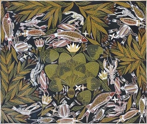 The creation story for Ganalbingu people took place near the middle section of the Glyde River where it becomes the Goyder River. Their land, Ngaliyindi, sits astride the Arafura Swamp in Central Arnhem Land. Many Ganalbingu artists paint totemic species significant to their clan. These can include baru (crocodile), banda (long necked turtle), buliya (catfish), yalman (waterlilies), gumang (magpie geese), dakawa (fresh water yabby), ratjuk (barramundi), warrnyu (flying fox) and more.