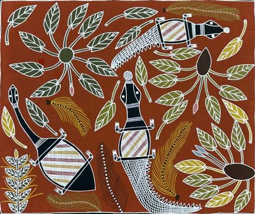 The creation story for Ganalbingu people took place near the middle section of the Glyde River where it becomes the Goyder River. Their land, Ngaliyindi, sits astride the Arafura Swamp in Central Arnhem Land. Many Ganalbingu artists paint totemic species significant to their clan. These can include baru (crocodile), banda (long necked turtle), buliya (catfish), yalman (waterlilies), gumang (magpie geese), dakawa (fresh water yabby), ratjuk (barramundi), warrnyu (flying fox) and more.