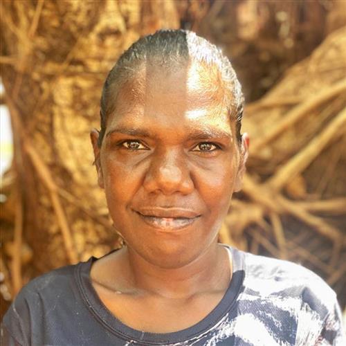 Bäru (the crocodile man), was from the Gumatj clan. People usually call him Gurdu Gurdu or Bäru which means crocodile. He lived his life at a place called Yirrkala. Living near him were other people, and when Bäru didn’t have enough to eat he began to kill and eat these other people. After a while others noticed that some people were missing. When Bäru went to the toilet, the people could smell this strong smell, so they knew that he ate the other people. Some men went to get help and they took message sticks to the other tribes. Some were sending smoke signals. When they came to Bäru’s camp they started to spear him in the left side of his ribs. He dropped into the fire and burnt his left hand and maybe his right hand. He then ran into the bush and yelled to his countrymen – the animals, birds and fish that live on the land and in the sea. He stopped and he named the tribes and clans and also the places until he came to a place called Gamarru/Guyurru. There he took a rest and said to himself “This is where I stop and call this place Gamarru/Guyurru”. Bäru, still in pain from the fire, then jumped into the water and turned himself into a crocodile. The fire left scars on his back. Bäru paintings belong to Gumatj and Warrawarra and also the Marpi clan. This painting is used at death ceremonies or initiations and it normally is painted on the belly, which means the person the design is painted on is part of Gurdu Gurdu (the crocodile people).