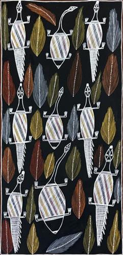 The creation story for Ganalbingu people took place near the middle section of the Glyde River where it becomes the Goyder River. Their land, Ngaliyindi, sits astride the Arafura Swamp in Central Arnhem Land. Many Ganalbingu artists paint totemic species significant to their clan. These can include baru (crocodile), banda (long necked turtle), buliya (catfish), yalman (waterlilies), gumang (magpie geese), dakawa (fresh water yabby), ratjuk (barramundi), warrnyu (flying fox) and more.