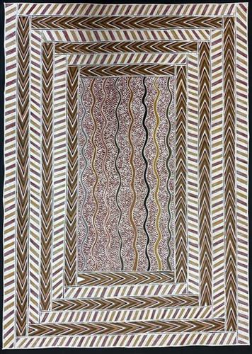 Lungurrma (North-east Wind) heralds the new season when seas are calm and new growth starts. The months for this type of wind are October to December. There are big clouds without thunder or rain. The triangular patterning represents monsoon clouds ‘standing up’ on the northern horizon. The Lunggurrma design belongs to the Yirritja moiety clans linked to this design are known as the ‘line of clouds’ clans