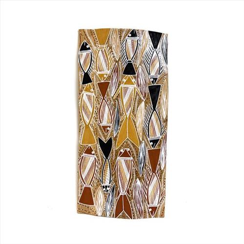 JB paints stories from his Dhuwa homeland in northeast Arnhem Land. Stories are passed on either paternally or maternally and JB would have learnt these stories from his ancestors. The cross-hatching style (Rrark) is a traditional painting style of this area and can represent elements such as water, air and wind.