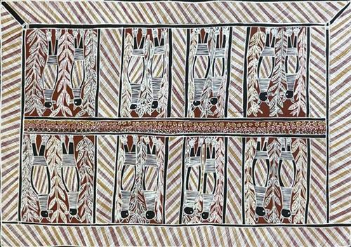 Leaving behind the cave at Kurrki Warrnyu Yirri Djaringal, the Dog travelled west across the Arafura Swamp and came to Djalkulmurr (Mount Delight). From there he travelled north and came to Dunganda (a hill situated a few kilometres east of Ramingining). There he met a female Dog, then they both headed north and came to a place called Garanydjirrmurr where they spoke the Mildjingi language. From Garanydjirrmurr they changed their direction and went west through Guliny’barra, Burgumara and onto the plains. When they reached the plains they smelled something cooking, way up in the north – at Wessel Islands. The aroma they smelt was so enticing that they decided to go there. Lungurrma (the north-east wind) was carrying the smell. One Dog headed north again, but the other Dog decided not to go with him and went back the opposite way. The first Dog that went to Malwanatharra (Sandy Point) went into the sea following its nose to wherever the smell was coming from. It is believed that this Dog still lives in the sea…