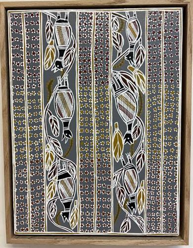 Back in the Creation time, Warrnyu (Flying Foxes) once lived, like men, in the cave at the place called Kurrki Warrnyu Yirri Djaringal (they also lived in caves called Wadatilmurr & Gurngurmirrngu). Warrnyu lived in these caves for many years and then one day Djanyarr (The Dog), an ancestral being in the form of a man, came along. He was looking around for a place to live. Djanyarr heard the sound of a Flying Fox screaming. He went down to the cliff and pushed the rock and the water came out at the Ganalbingu place called Gurrkawakarrmurr. He then went into the cave and into the sacred hole, frightening all the Flying Fox away. When he went into the hole he left his dilly bag in the tree and went out on the other side of the sacred cave and leaving his spear and woomera. He sat there for a long time. The Dog made three streams and the water went inside the cave. Two of these streams are good drinking water. In the middle it is a sacred water. No-one drinks from the middle of the stream. Children, men, women, young boys or girls are not allowed to drink from the middle of the stream. If they drink the water from the middle of the stream they will go grey too early.