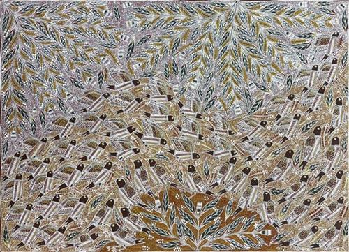 This artwork represents totemic finches. These birds herald the beginning of the dry season and are associated with the Ganalbingu clan. Lidji Lidji are also represented in ceremonial song and dance.