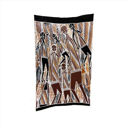 This painting is about the story of the rock Mewal, that is the embodiment of the spirit man Mokuy who created the honey men/sugar bag tribe. In the story, Mokuy runs away from from a burning grass fire and to escape he turns into the special curved shape rock that is just outside Ramingining. In this painting people are singing and dancing to Mewal around a special tree. It is a ceremony day. People are also collecting Yams (Pitarro) a bush tucker vegetable that is black on the outside and white on the inside.