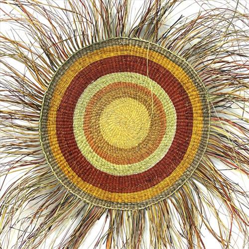 Traditionally, Nganiyal (conical mats) functioned as insect screens when erected and as seating mats when folded, playing an important role in both daily life and ceremonial practices. Today, Yolŋu artists create a variety of shapes, including flat, round, and oblong mats. These non-traditional styles and the use of bright colours became more common after Missionaries began commissioning pieces in this style.