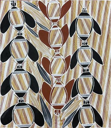 JB Fisher often paints subjects related to the Sugar Bag story, a story he has inherited. Sugarbags, or Gulka as it is locally known, are the native honeys found in the bush surrounding Ramingining.