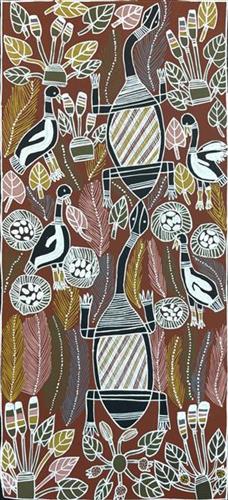 The creation story for Ganalbingu people took place near the middle section of the Glyde River where it becomes the Goyder River. Their land, Ngaliyindi, sits astride the Arafura Swamp in Central Arnhem Land. Many Ganalbingu artists paint totemic species significant to their clan. These can include baru (crocodile), banda (long necked turtle), buliya (catfish), yalman (waterlilies), gumang (magpie geese), dakawa (fresh water yabby), ratjuk (barramundi), warrnyu (flying fox) and more.