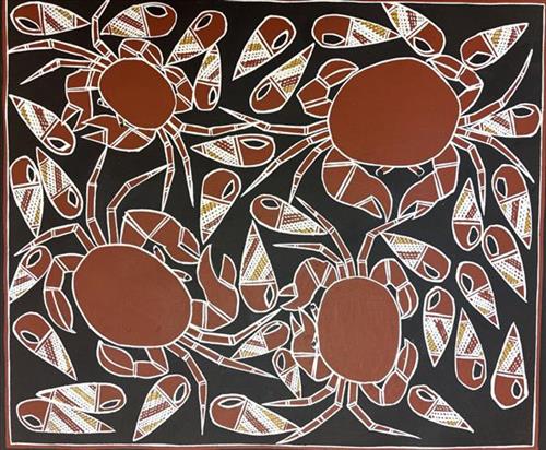 Here the artist paints shellfish and mud crabs at Gariyak, the county represented in many paintings relating to the Djang’kawu Sisters’ journey. In the coastal mangroves the sisters hunted mud crabs, and baler and conch shells to eat.