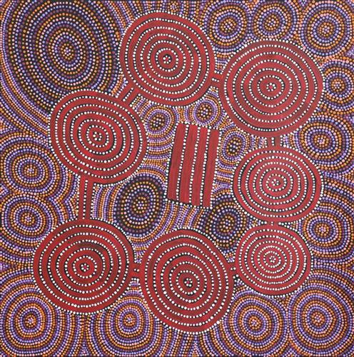 The Wardapi Jukurrpa [Varanus Gouldii Goanna] belongs to the Spencer Sisters. It comes from Yarripilangku [aka Yinyiripalangu], south-west of Yuendumu. A group of Warlpiri Karnta [women] are sitting down in a circle when a Japangardi Wati [man] from Puturlu [Mt Theo], called Wamaru came upon them. He wants to take one of them, named Yurlkurinyi, of Nungarrayi skin, which is the wrong skin for him. He takes the Nungarrayi woman up a hill, where they make love. In response, the earth on top of the hill turns to Ngunjungunju [white ochre], and yellow and red ochre. The yellow is for Karnta and the red for Wati. The ochre is used by Warlpiri people for love magic and ceremonial decoration. The Wati turns all the Karnta and himself into Wardapi, aka Varanus Gouldii goannas. This Jukurrpa belongs to the Napaljarri/Japaljarri and Nungarrayi /Jungarrayi subsections, and the Japanangka/Napanangka, Japangardi/Napangardi subsections of Puturlu. The women are often represented by ‘U’ shapes. Concentric circles may illustrate Wardapi holes, or their droppings left behind them, and Wardapi tracks are usually represented by ‘W’ shapes and wavy lines.