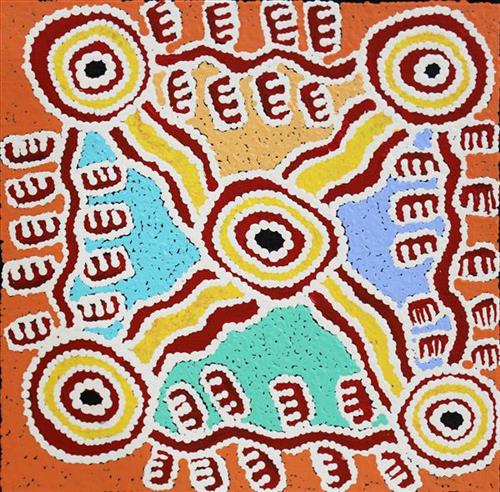 The Wardapi Jukurrpa [Varanus Gouldii Goanna] belongs to the Spencer Sisters. It comes from Yarripilangku [aka Yinyiripalangu], south-west of Yuendumu. A group of Warlpiri Karnta [women] are sitting down in a circle when a Japangardi Wati [man] from Puturlu [Mt Theo], called Wamaru came upon them. He wants to take one of them, named Yurlkurinyi, of Nungarrayi skin, which is the wrong skin for him. He takes the Nungarrayi woman up a hill, where they make love. In response, the earth on top of the hill turns to Ngunjungunju [white ochre], and yellow and red ochre. The yellow is for Karnta and the red for Wati. The ochre is used by Warlpiri people for love magic and ceremonial decoration. The Wati turns all the Karnta and himself into Wardapi, aka Varanus Gouldii goannas. This Jukurrpa belongs to the Napaljarri/Japaljarri and Nungarrayi /Jungarrayi subsections, and the Japanangka/Napanangka, Japangardi/Napangardi subsections of Puturlu. The women are often represented by ‘U’ shapes. Concentric circles may illustrate Wardapi holes, or their droppings left behind them, and Wardapi tracks are usually represented by ‘W’ shapes and wavy lines.