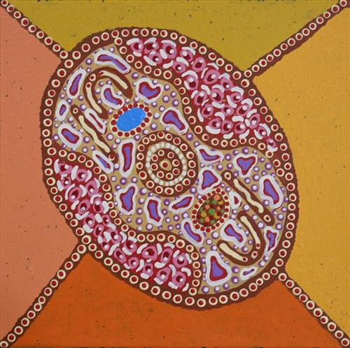 There are many stories about the Minyma Kutjara [Two Sisters]. The Minyma Mingkiri are collecting bush foods together when the Minyma Kutjara decide to go travelling. They travel to several water sources to the north and east. They keep going until they get to a waterhole. They come across a man sleeping. They hit him over the head with their wana [digging stick] and knock him unconscious. Then they tie him up, and continue on towards Alice Springs, carrying him between them. They sing and dance sacred women’s stories all the way. They leave him at Stuart’s Well, and continue on to Alice Springs to meet up with a large group of women.