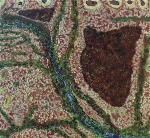 Rodney paints his country from his memory and the images etched in his mind. He carefully maps the landscape out as he remembers it from his childhood. Many of the places he depicts have since been disturbed by mining or have been destroyed by cyclones and the harsh Pilbara weather. His ability to capture the essence of these places on canvas is to be admired. A secret blend of Pilbara earth behind all his works gives them an authentic texture and real colour.