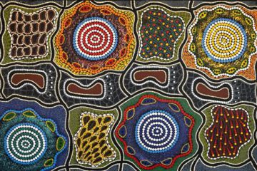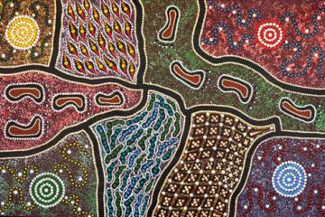Dawn is a confident artist whose ideas flow freely and easily on to the canvas. She is naturally gifted in design and has a sure sense of colour. The inspiration for her paintings comes from spending time in her Country at different times of the year: the rocks, with the rich colours that pass over their surfaces at varying times of the day; the river and the bush flowers. She mostly paints from an aerial perspective and has developed a number of styles to depict her various subjects.