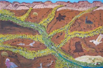 Native Wildlife Animals from Yindjibarndi Country. *Damaged at top. Price reflects peeling paint. This artwork is currently on stretched canvas. We will have to obtain a freight quote if you would like to purchase this Read more…