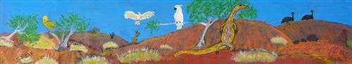 Rodney paints his country from his memory and the images etched in his mind. He carefully maps the landscape out as he remembers it from his childhood. Many of the places he depicts have since been disturbed by mining or have been destroyed by cyclones and the harsh Pilbara weather. His ability to capture the essence of these places on canvas is to be admired. A secret blend of Pilbara earth behind all his works gives them an authentic texture and real colour.