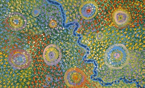 This painting represents the pilbara country with river and wildflowers. After the rain the spinifes and grasses go green with new growth.