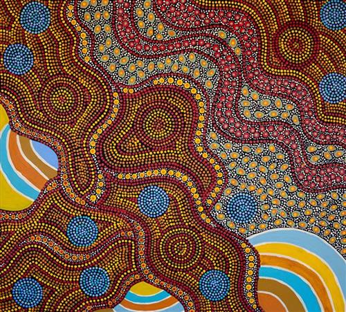 Dawn is a confident artist whose ideas flow freely and easily on to the canvas. She is naturally gifted in design and has a sure sense of colour. The inspiration for her paintings comes from spending time in her Country at different times of the year: the rocks, with the rich colours that pass over their surfaces at varying times of the day; the river and the bush flowers. She mostly paints from an aerial perspective and has developed a number of styles to depict her various subjects.