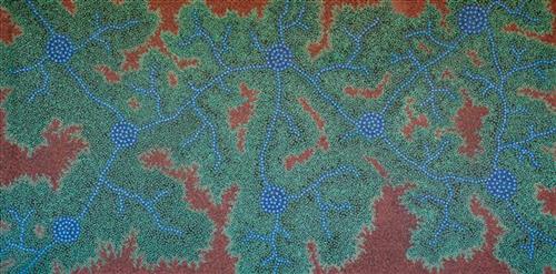 This painting is the representation of the fresh water swimming spots throughout Yindjibarndi country connecting through the country and the green trees surrounding them, providing perfect shade and cooling in the Pilbara heat. The reddish brown is for the dirt that rich and unique to the country. I wanted to capture the beauty through the colours and also in a way that you could recognise the landscape which is the Pilbara.