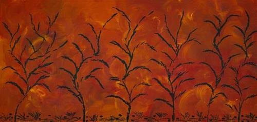 Melissa started painting in late 2006. She has no formal training and painting started as something to pass the time. She quickly developed her own style with a natural flair for design and dot painting. As she continues on her painting journey she has developed a more contemporary style. Melissa is meticulous about her choice of colours, spending a lot of time mixing her paints to achieve the right colours to complement each other. The stories that go with her paintings express the land and the plants from her Country and the stories told by her Elders. Melissa’s work is deeply personal and she is known for expressing her emotions through her paintings. She uses her art as a way of processing everyday life so her paintings give intimate insight into her inner world.