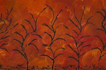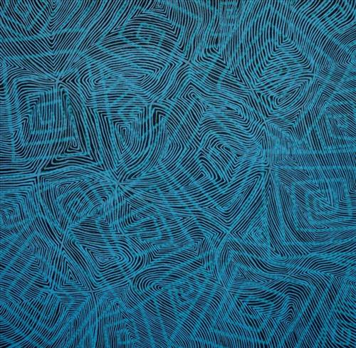 There are many salt flats in the Pilbara.This painting depicts the water flowing underneath with the salt forming on top in ripples to show the movement of the ocean.