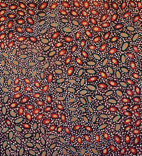 Dawn is a confident artist whose ideas flow freely and easily on to the canvas. She is naturally gifted in design and has a sure sense of colour. The inspiration for her paintings comes from spending time in her Country at different times of the year: the rocks, with the rich colours that pass over their surfaces at varying times of the day; the river and the bush flowers. She mostly paints from an aerial perspective and has developed a number of styles to depict her various subjects.