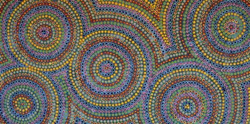 Dawn is a confident artist whose ideas flow freely and easily on to the canvas. She is naturally gifted in design and has a sure sense of colour. The inspiration for her paintings comes from spending time in her Country at different times of the year: the rocks, with the rich colours that pass over their surfaces at varying times of the day; the river and the bush flowers. She mostly paints from an aerial perspective and has developed a number of styles to depict her various subjects.