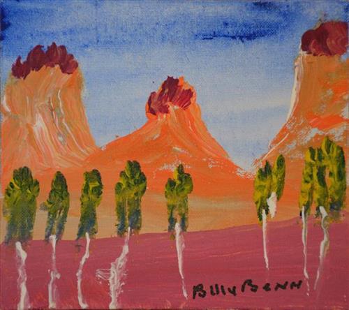 Since 1981, Billy worked at Bindi Inc, an organisation established to provide employment opportunities, support and advocacy for people with a disability in Alice Springs. During his time constructing metal boxes in the Brown Street workshop, he identified a space which became his corner to paint in. He began to visually map out his father's country via the painted image, using old boards discarded by the Alice Springs Timber Mill. Working as many outsider artists do, with second rate materials, on any surface that appealed, Billy painted using his fingers, cloth, glue and varnish. Despite the brilliant landscapes being created, they were only shown once prior to 2000 in an exhibition of artworks done by people with a disability in the 'Beyond Passions' exhibition in Alice Springs. All his work sold, and yet, the low profile of the exhibition, meant that his work had still not been viewed by the wider market. The Mwerre Anthurre Artist collective was founded around his talent in 2000.