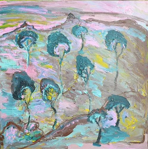 Adrian joined The Bindi Mwerre Anthurre Artists in 2002. He is a landscape painter and uses a predominantly restricted palette. His paintings consistently refer to the desert mountains, ridges and trees which are part of Yalpirakinu. His brushwork is loaded with energy, drama and memories. He is a deliberate and thoughtful painter; reworking, pushing and pulling the image to completion.