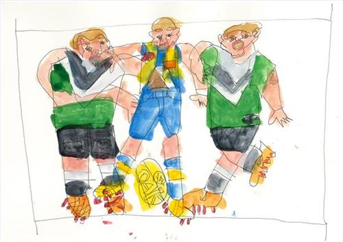 Conway is a passionate football supporter, music lover, and dedicated artist. He draws inspiration from a range of sources - newspapers including Land Rights News, images from books and magazines, his memory and visits back to Docker River. Conway’s work reflects his vibrant sense of humour. The playful compositions and confident lines illustrate life in Central Australia, capturing everyday moments.