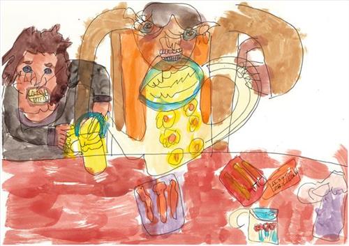Daughter & Father Drinking Tea & Working & Sandwich & KFC & Pizza