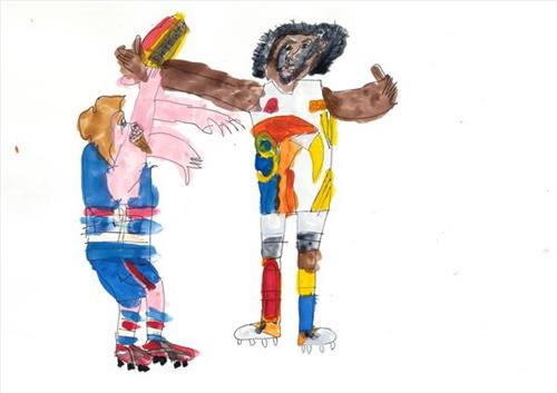 Conway is a passionate football supporter, music lover, and dedicated artist. He draws inspiration from a range of sources - newspapers including Land Rights News, images from books and magazines, his memory and visits back to Docker River. Conway’s work reflects his vibrant sense of humour. The playful compositions and confident lines illustrate life in Central Australia, capturing everyday moments.