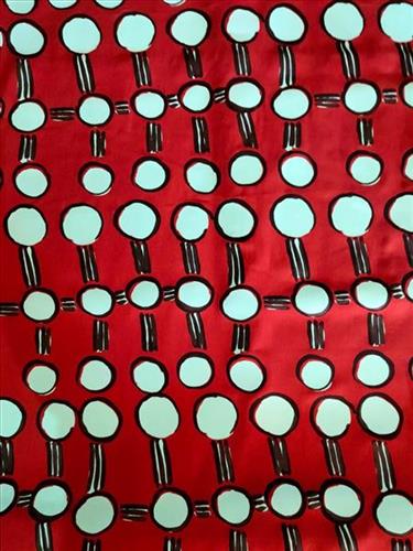 The design shows the artist’s father’s country, Lake Mackay. It tells the story about a large bushfire coming from the east turning the land into a lake. The circles in the paintings stand for water holes scattered around and the lines between are the tracks of animals looking for water.