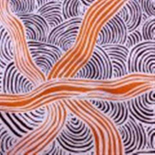 This painting shows kungkaku puturru – the hairstring women make from their own hair for ceremony. In the older days, women used to cut their own hair and create this string by spinning the hair on their thighs. The hairstring was used for dancing, ceremony and domestic purposes. Kungkaku puturru is connected to the Tjukurrpa place Kungkayunti (Brown’s Bore). Kungkayunti is the place where the ancestral women, who travelled from Ntaria (Hermannsburg) to the west of Kintore, stopped and danced. Kungkayunti means women dancing.