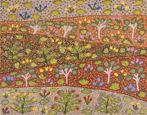 Beverly paints her Mother’s country. When Beverly was a child her mother took her all around her country and showed her the bush medicine and bush tucker.