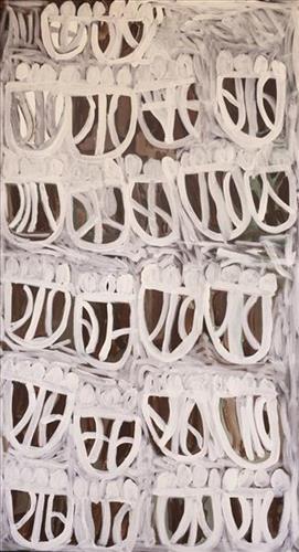 Anhelengkw (emu) dreaming is the breast body painting depicting the story of the mother emu who runs away and leaves the father emu to look after the eggs until they hatch, he then raises the chicks.