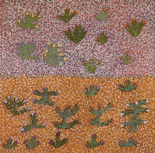 I was born in Irrultja, my father’s country. I paint therrpeyt, a plant with red and pink flowers, it is my family symbol. You can suck the flowers to get a sweet honey from. You can wash your body with the leaves to heal sores and clean your body. I paint arreth which grows in the rocky ground and helps fix my sore throat when I make a hot tea from the leaves. I love to paint, I feel happy when I paint, I feel busy and good.