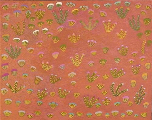 Lilly has painted her country, Antarrengeny. The brightly coloured flowers and small bushes are bush medicine and are still used within the community.