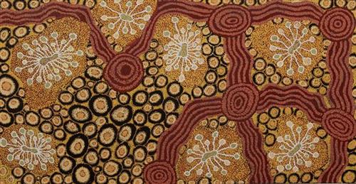 There are many stories about the two sisters (Minyma Kutjara). This part of the story is siginificant to the women of Ernabella. There was a gathering of minyma mingkiri (mouse women) at a hill called Yunanpa, which is near Ngarutjara (to the north of Ernabella). They are all collecting bushfoods together when the two sisters decide to go travelling. They travel to several water places to the north and east of Ernabella including Alalka. They keep going until they get to Wamitjara, a waterhole near Kenmore park. Here they come across a man sleeping. They hit him over the head with their wana (digging stick) and knock him unconscious. Then they tie up his arms and legs and head towards Alice Springs, carrying him between them. They sing and dance sacred women’s stories all the way. They leave him at Stuart’s Well, and continue on to Alice Springs to meet up with a large group of women.