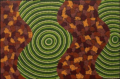 Artists use this title when they are depicting their Country. It might be a representation of a particular place or of different aspects of that area. The artist uses a combination of colour and design to indicate variations in the landscape. Inspiration is drawn from all elements of Country and might include bush tucker, water holes, meeting places, rock formation, birds or animals.