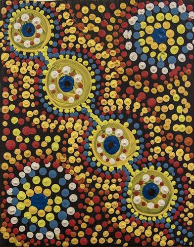 Artists use this title when they are depicting their Country. It might be a representation of a particular place or of different aspects of that area. The artist uses a combination of colour and design to indicate variations in the landscape. Inspiration is drawn from all elements of Country and might include bush tucker, water holes, meeting places, rock formation, birds or animals.