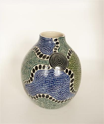 Bernadine belongs to the artistically renowned Lewis family. Her aunties are Michelle, Lynette and Langaliki Lewis, all highly accomplished Ernabella artists. Bernadine is a young mother, and she has been coming to the art centre since the beginning of 2018.  She works on both canvas and ceramics and is finding her style as a new emerging artist.