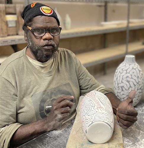 Derek continues to be a key figure and leading artist in the ceramics studio, using clay to create beautifully detailed renditions of Country.