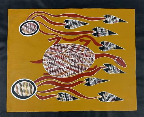 Harry works with both modern acrylics, as well as traditional ochres/stones and is confident with a Jarlk reed brush. He works on canvas and bark, while also carving yidaki or didj, and larrakitj or lorrkon.