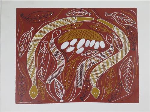 All artworks are made by local artists living in the community. Artwork reflects the traditional songs and stories that have been passed down through the generations with a contemporary edge.  Fibre art is a special feature of Djilpin Arts as is its Gapu Series of fine art prints.